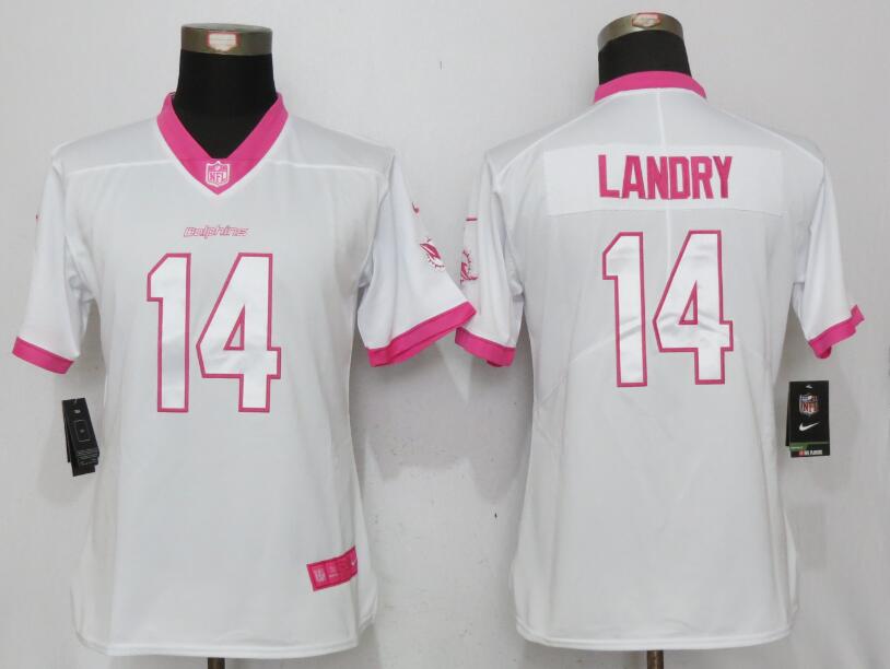 Women Miami Dolphins 14 Jarvis Landry Stitched Elite Rush Fashion Jersey White Pink