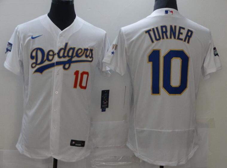 Nike Los Angeles Dodgers #10 Justin Turner 2021 Gold Program Flexbase Jersey White/Gold