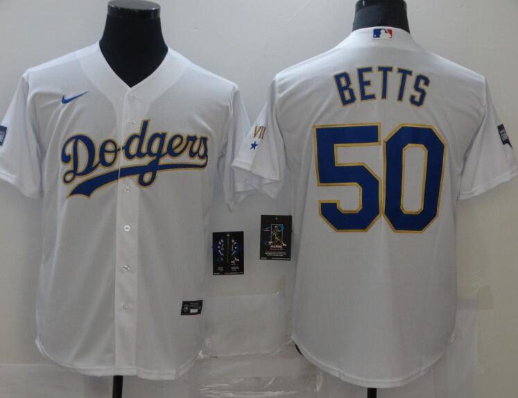 Nike Los Angeles Dodgers #50 Mookie Betts White/Gold 2021 Gold Program Cool Base Jersey White/Gold