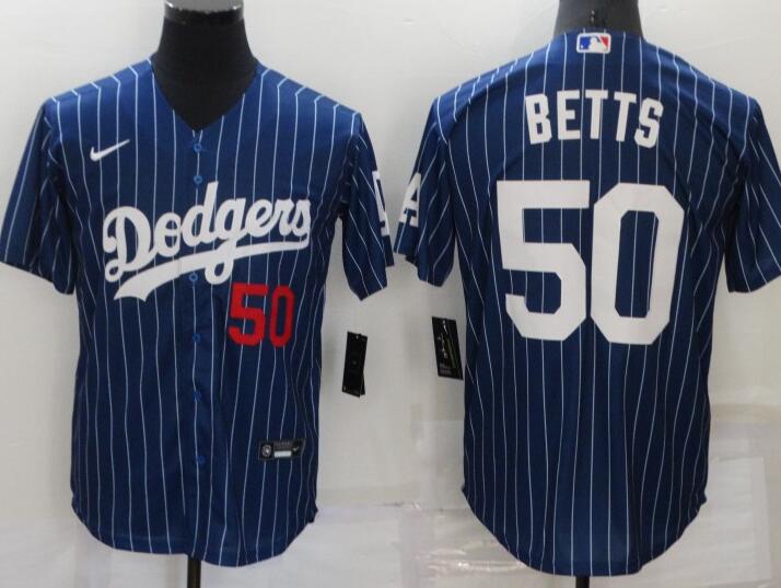 Nike Los Angeles Dodgers #50 Mookie Betts Pinstrip Cool Base Jersey Blue