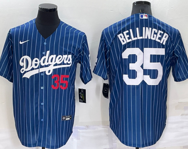 Nike Los Angeles Dodgers #35 Cody Bellinger Pinstrip Cool Base Jersey Blue