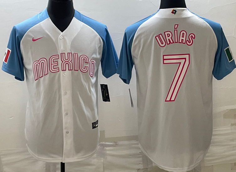Mexico #7 Julio Urias With Blue Sleeves Jersey White
