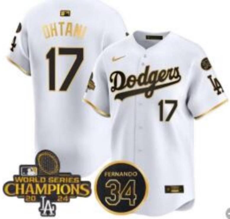 > MLB Jerseys > Los Angeles Dodgers > Los Angeles Dodgers #17 Shohei Ohtani with 2024 Champions Patch and 34 Black Patch Players Limited Jersey White Golden